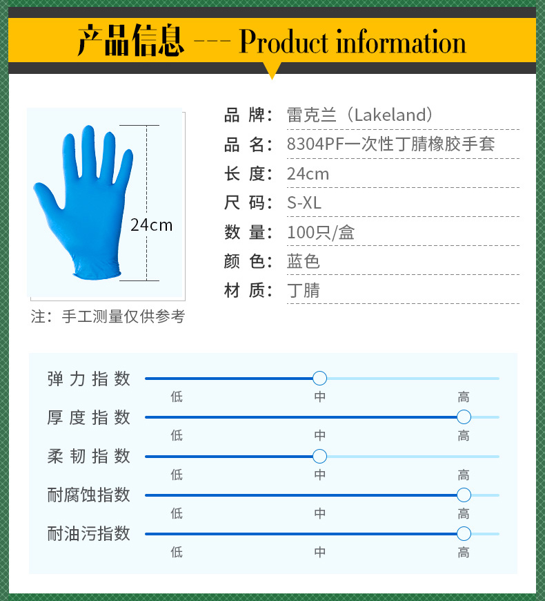 雷克兰 8304PF一次性劳保橡胶手套无粉麻面丁腈餐饮手套防油耐酸碱实验