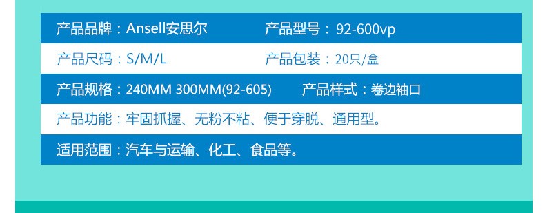 安思尔 92-600一次性丁腈手套加厚丁晴食品家务清洁检查防水防滑定做工作防护厨房劳保洗车