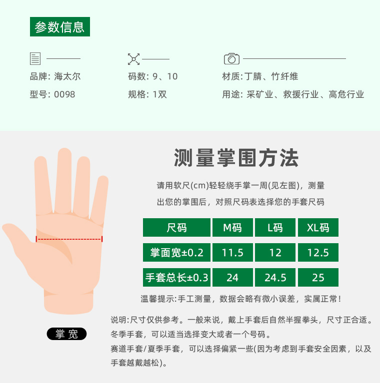 海太尔 0098矿业防撞手套 手掌浸磨砂丁腈耐磨 防震机械劳保手套